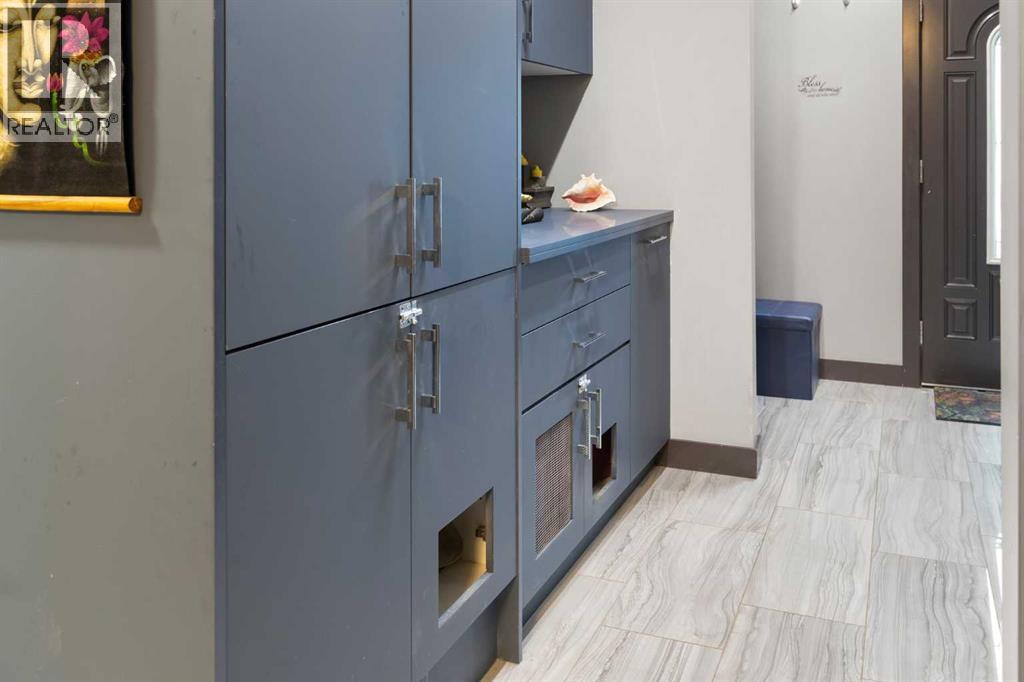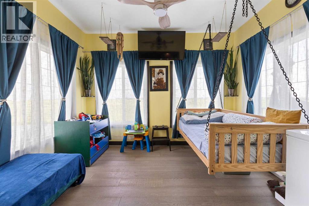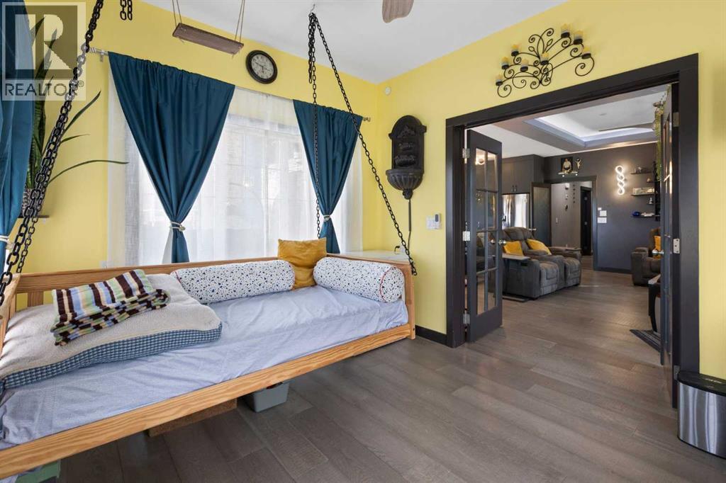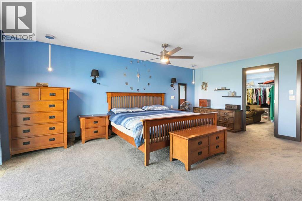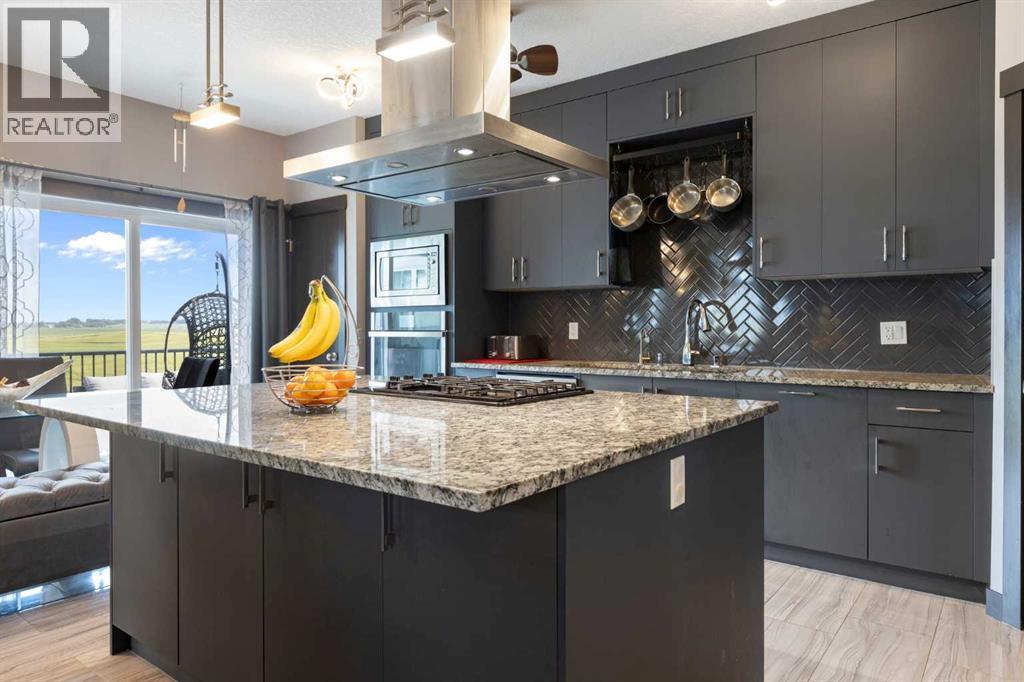 Exceptional 6-Bedroom + Den Walkout Backing onto Muirfield Lakes Golf Course – Almost 3,800 Sq. Ft. of Versatile Living!This fully finished two-storey walkout offers nearly 3,800 sq. ft. of thoughtfully designed space—perfect for multigenerational living, entertaining, and everyday comfort.The main floor boasts a bright, open layout with a spacious bedroom and full bathroom—ideal for guests or aging family members. A stunning sunroom (easily a 7th bedroom) adds even more flexibility. At the heart of the home, the chef-inspired kitchen features a massive island with gas cooktop, stainless steel appliances, walk-in pantry, reverse osmosis system, soft-close cabinetry, and a separate broom closet. The open dining and living areas flow onto the raised deck with breathtaking golf course and pond views, while the great room is anchored by a sleek electric fireplace with custom built-ins.Upstairs, the oversized primary suite is a true retreat with his-and-hers walk-in closets, dual vanities, separate his-and-hers toilets, and a private balcony. A large bonus room, generous laundry room, and another bedroom with walk-in closet complete this level.The fully developed walkout basement adds three more bedrooms (or home offices), a full bath, spacious living/dining area, wet bar, and plenty of storage.The outdoor spaces are as impressive as the interior: a professionally landscaped backyard with fruit trees, raised garden beds, gazebo, fire pit area, upper and lower decks with gas hookups, and a patio wired for a hot tub. Two large sheds provide extra storage.Pet lovers will appreciate the private dog run with dog door, built-in dog wash, and discreet custom cat litter cabinet. The oversized garage is extra wide/deep and EV-ready with a 240V plug. Additional highlights include A/C, central vac, water softener, upgraded lighting and fans throughout, functional mudroom with multiple closets and cabinetry, brand-new roof, garage door, and updated railings. Located just 10 minutes from Strathmore and 30 minutes to Calgary, this home combines luxury, versatility, and modern convenience in a peaceful golf course setting. (id:58070)