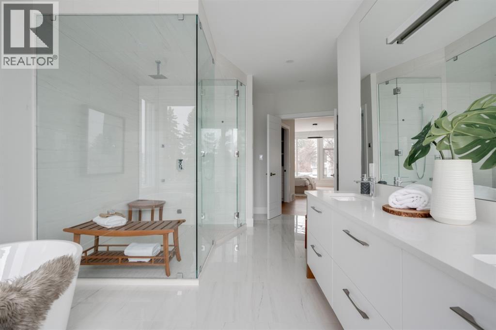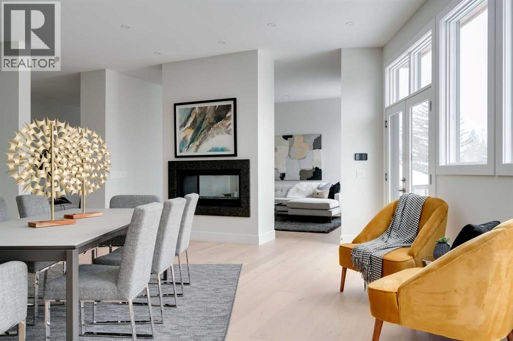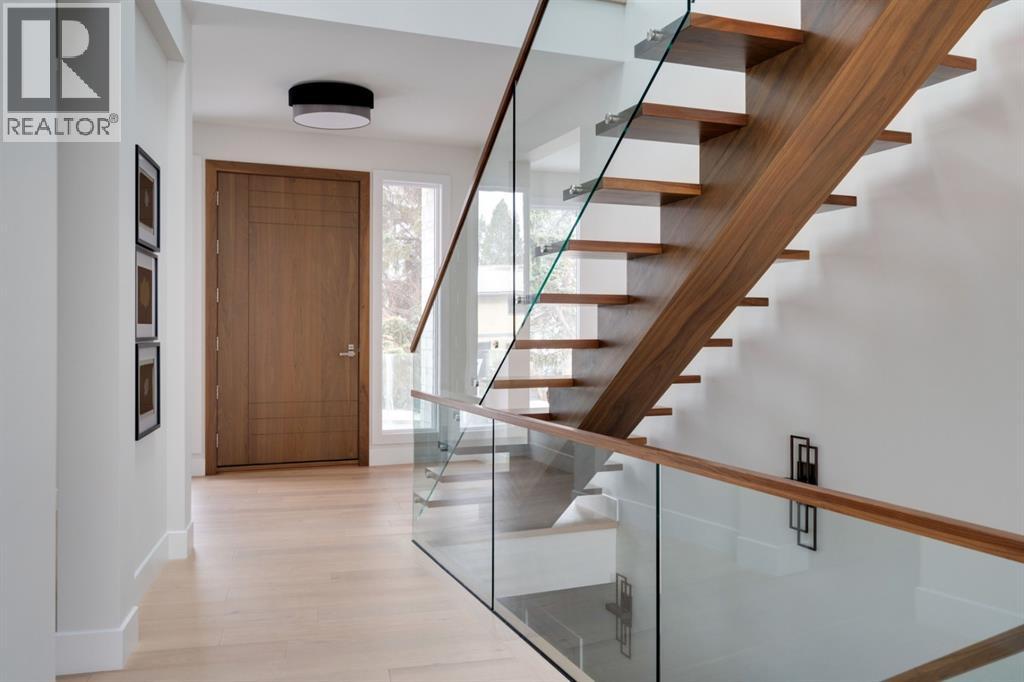 Built in 2020, this striking contemporary home offers 4,567 sq. ft. of thoughtfully designed living space, blending refined minimalist architecture with sophisticated modern finishes. Inspired by a relaxed, Californian sensibility, the home seamlessly balances everyday family living with stylish entertaining. Upon entry, a dramatic floating glass staircase makes an immediate architectural statement. The formal living room is both spacious and inviting, easily accommodating a grand piano while maintaining an intimate feel. The adjacent dining room is ideal for hosting large family gatherings or elegant dinner parties. At the rear of the home, a stunning wall of windows spans the family room, casual dining area, and sleek kitchen, flooding the space with natural light and creating a seamless sense of openness. A double-sided fireplace subtly defines the living zones while preserving a connected flow. The kitchen features a striking mix of high-gloss and warm wood cabinetry, a generous island designed for gathering, and a well-planned pantry offering excellent storage. Step directly from the kitchen onto a tiered deck and into the sunny, south-facing backyard, a private outdoor space ready for your personal vision. A versatile flex room off the kitchen is perfect for a home office, playroom, or cozy lounge. Upstairs, the expansive primary suite is a true retreat, complete with a luxurious ensuite, an impressive walk-in closet, and a that connects to an office or a room you can develop into a second closet. Three additional bedrooms, each with its own ensuite, provide exceptional comfort and privacy. The lower level includes a bright recreation room, a fifth bedroom, and a functional mudroom ideal for busy family life. Additional highlights include air conditioning, a heated driveway and an exceptional four-car garage. With generous proportions, contemporary design, and outstanding potential to personalize, this modern luxury home is ideally located in one of the city’ s most sought-after neighbourhoods. (id:58070)