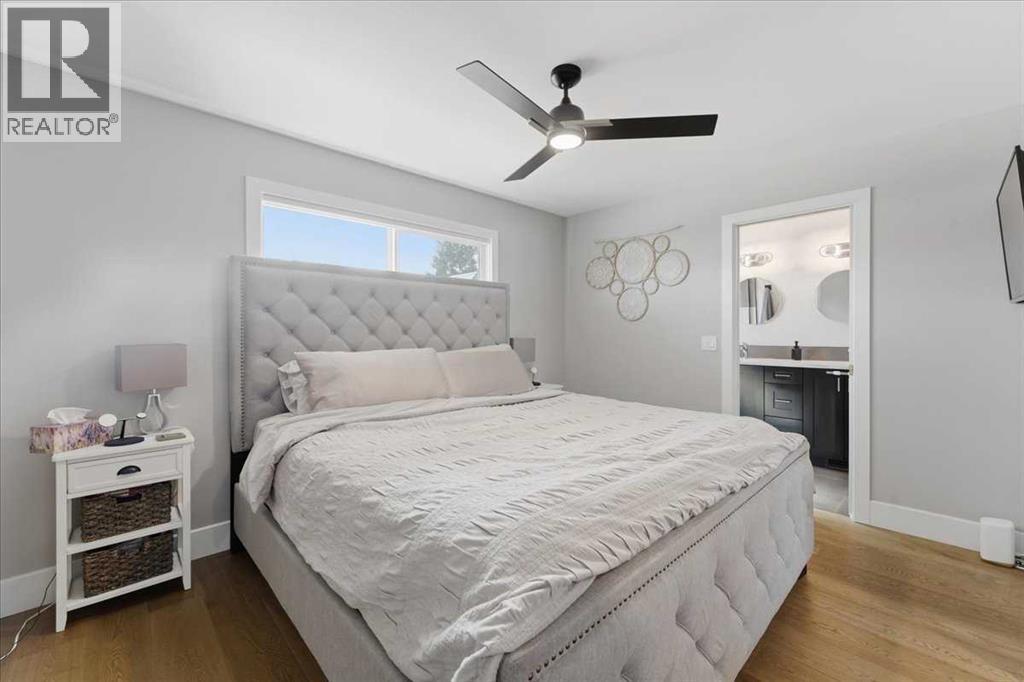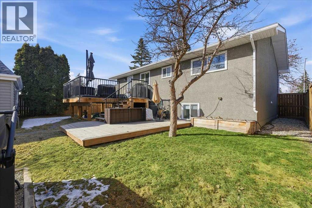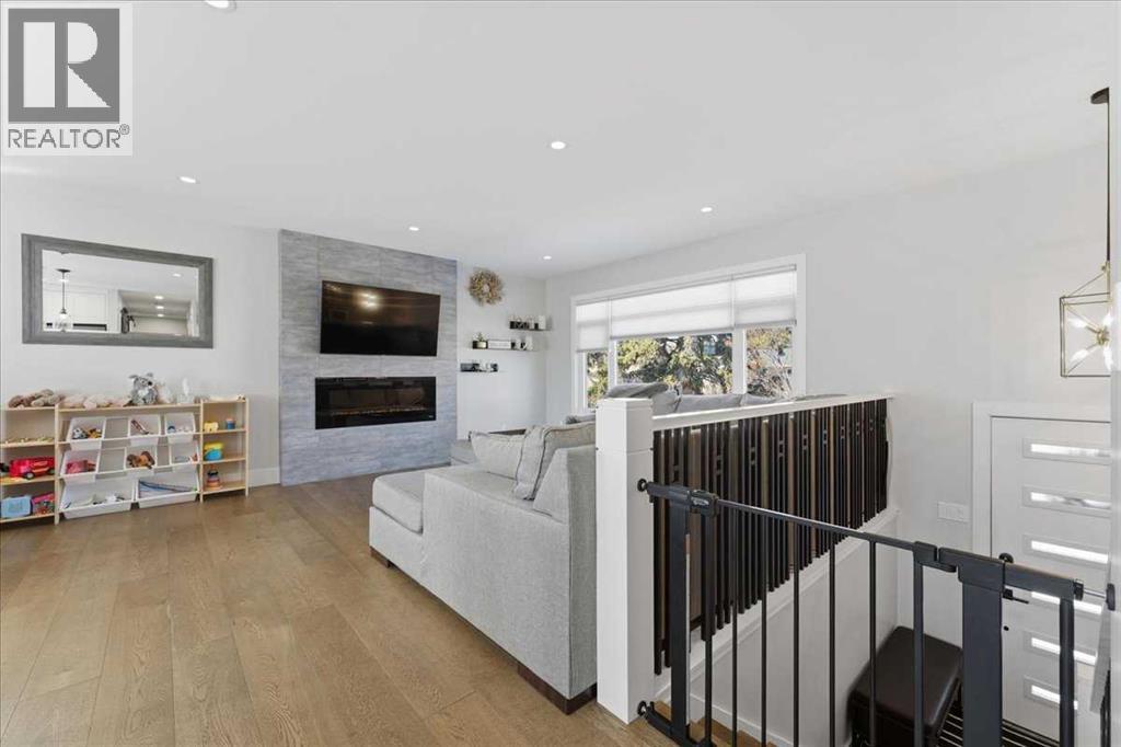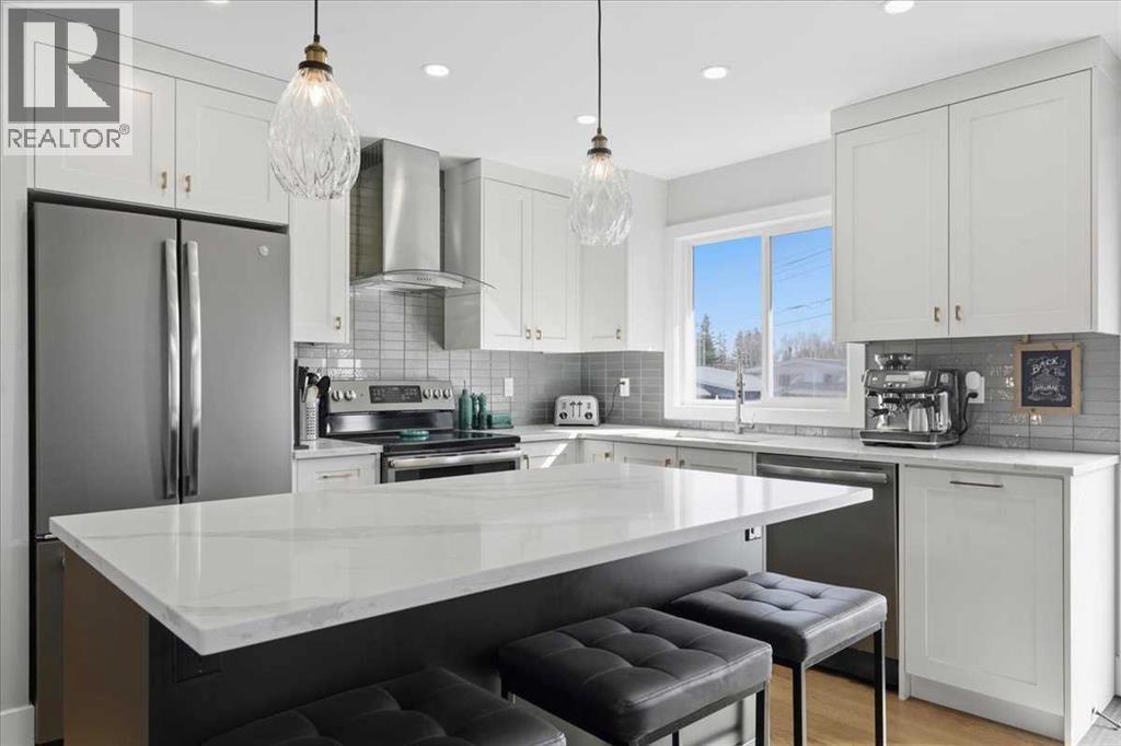 Fully renovated and extensively upgraded, this 4-bedroom, 3-bath bi-level sits on a quiet cul-de-sac close to schools and everyday amenities.The main floor features a bright, open layout with engineered hardwood throughout, two spacious bedrooms, and thoughtfully designed storage including custom California Closets installations. The kitchen is a standout—complete with GE stainless steel appliances, quartz countertops, a large custom island, tile backsplash, pull-out spice storage, and built-in waste and recycling.The primary suite offers a full walk-in closet and a well-appointed ensuite with a custom tiled shower, double vanities, and tile flooring. The main living area is anchored by an electric fireplace with a feature tile wall, creating a clean, modern feel.Downstairs, you’ll find two additional bedrooms with built-in desk spaces, a full bathroom with tiled surround, a spacious rec room with wet bar, and durable vinyl plank flooring throughout. A separate laundry room includes washer and dryer.The majority of the renovations were completed in 2020, including shingles on both the house and garage, poured concrete sidewalks, upgraded 200-amp electrical service with new panel and full rewire, new plumbing, windows and doors, high-efficiency furnace with all new ductwork, high-efficiency hot water tank, lighting, and interior finishes. More recent upgrades include central air conditioning, the expanded two-tier deck, and hot tub.The backyard is set up for both function and entertaining—featuring an oversized double detached garage with loft, newer opener, additional parking pad, and gated RV/trailer access.Turnkey, fully upgraded, and located in a prime, quiet setting—this is a move-in ready home with no corners cut. (id:58070)