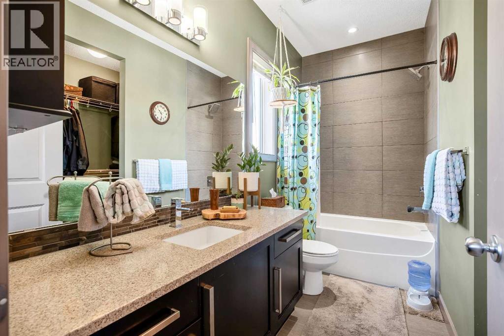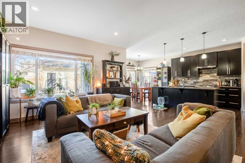 Welcome to a rare gem that perfectly blends comfort, functionality, and thoughtful upgrades in one exceptional home. Step inside to a bright, open-concept main floor designed for both everyday living and effortless entertaining. Rich espresso maple hardwood floors flow throughout, complemented by elegant spindled railings that maintain an airy, open feel. A private front flex room offers versatility as a formal dining space or home office. The kitchen is truly an entertainer’s dream — showcasing an oversized island, over-height cabinetry, concrete countertops, updated backsplash, stylish hood fan, and high-end stainless steel appliances. The spacious great room is anchored by a stunning mosaic tile gas fireplace, while the large dining nook, rear mudroom, and convenient main-floor laundry complete this thoughtfully designed level. Nine-foot ceilings on both the main and upper floors enhance the sense of space and natural light throughout. Upstairs, the generous primary suite features a large walk-in closet and a well-appointed four-piece ensuite. Two additional bedrooms and another four-piece bathroom provide comfortable space for family or guests. The professionally developed basement expands your living space even further. Enjoy movie nights in the custom theatre room, professionally installed with resilient channel ceiling sound dampening and wired for 7.2 surround sound. There is additional space for a pool table, home gym, or the option to convert to a fifth bedroom. The spa-inspired basement bathroom offers a sauna-like ambiance and heated ceramic floors with a separate thermostat for ultimate comfort. Outside, the beautifully landscaped, low-maintenance yard is designed with native Alberta plants that thrive naturally with rainfall alone. Enjoy your own backyard harvest with established sour cherry, choke cherry, raspberry, and blueberry bushes, plus asparagus. The yard also remains a wonderful blank canvas for any additional landscaping dreams. The oversized double garage provides ample space for vehicles and storage, with extra room beside for future RV parking or an additional parking pad. Abundant storage throughout the home — including under-stair and flex-area storage — ensures everything has its place. Ideally located with easy access to Stoney Trail and Deerfoot Trail, and within walking distance to shopping, schools, and beautiful community parks. This is the one you’ve been waiting for — book your private showing today! (id:58070)