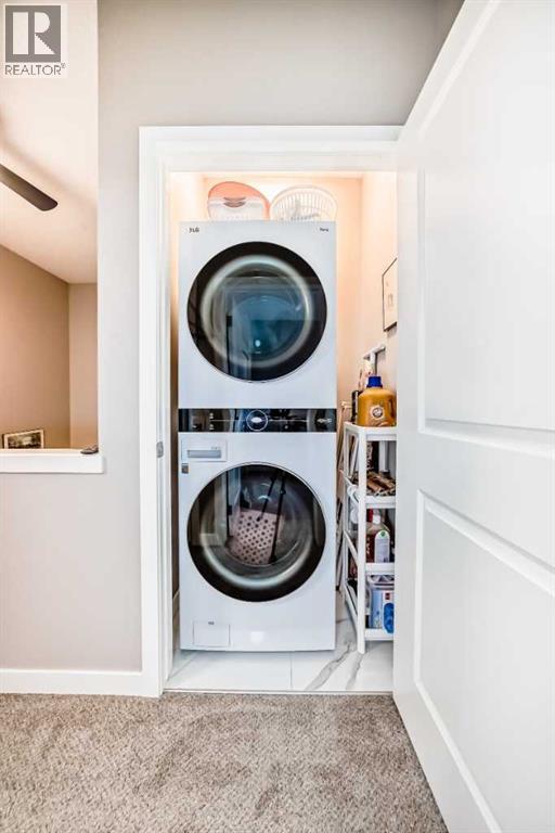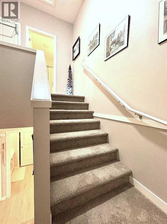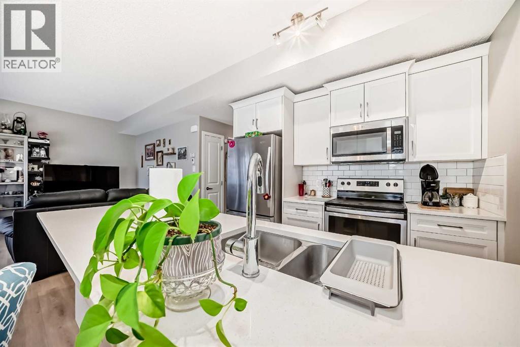 Welcome to this stunning and immaculately maintained townhome located in the highly desirable community of Fireside in Cochrane, where breathtaking views of the pond and surrounding green space provide a tranquil, nature-inspired backdrop to everyday living. This thoughtfully designed home showcases a beautiful blend of modern style and everyday functionality, featuring upscale finishes such as wide plank laminate flooring, soft plush carpeting, elegant porcelain tiles, soaring 9-foot ceilings, and energy-efficient LED lighting throughout. The heart of the home is the gourmet kitchen, equipped with sleek quartz countertops, crisp white Euro shaker-style cabinetry, stainless steel appliances, a convenient breakfast bar for casual dining, soft-close pull-out drawers, and a spacious pantry that ensures ample storage. The open concept is filled with natural light that flows seamlessly from an abundance of large windows and patio doors, onto two private balconies, offering a perfect extension of your living space where you can enjoy morning coffee’s or unwinding in the evening while soaking in peaceful views of the pond and green space. Upstairs, you’ll find two generously sized bedrooms, including a bright and spacious primary retreat complete with a large walk-in closet, along with a stylish full bathroom,- and an additional powder room on the main level , both featuring quartz countertops and chic, modern light fixtures. The home also includes a full-sized laundry area with a stacked washer and dryer conveniently located on the upper floor, wide staircases for easy access, and a spacious utility room for extra storage. There is also a larger, separate dedicated storage unit, and a titled parking stall just steps from the front entrance. Situated in a well-managed, family-friendly complex with ample visitor parking, this property is ideally located just steps away from scenic walking paths, tranquil ponds, a gazebo, benches, and beautifully landscaped green spaces, mak ing it perfect for peaceful walks, picnics and outdoor relaxation. Fireside is a vibrant and growing community offering excellent schools, charming local eateries, shopping, and all the essential amenities you need, all just minutes from the heart of Cochrane—making this home the perfect combination of comfort, convenience, and modern living; "Don’t miss the opportunity to make it yours." (id:58070)