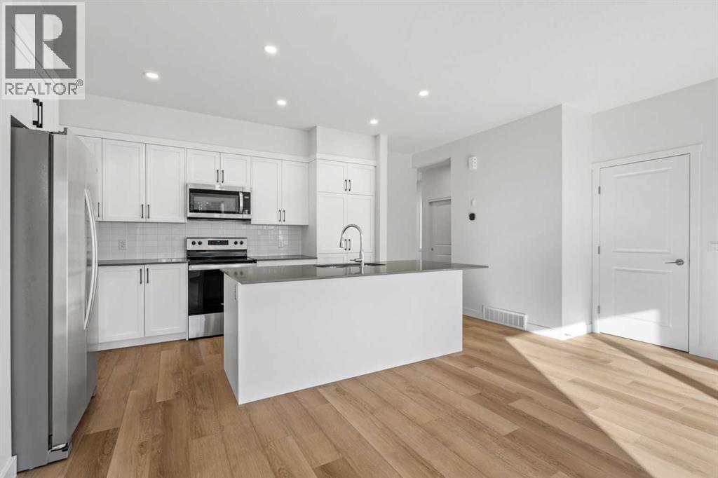 NEW BUILD TOWNHOME | NO CONDO FEES | 3 BED / 2.5 BATH / 1,519 SQ FT | DOUBLE ATTACHED GARAGE + DRIVEWAY | READY FOR POSSESSION – Welcome to the Thistle model by Minto Communities, an award-winning Canadian builder with over 70 years of experience, located in East Hills Crossing, one of southeast Calgary’s fastest-growing and most convenient communities. These thoughtfully designed townhomes feature modern finishes, functional layouts, and long-term value in a location that truly stands out. This lower-level unit offers a smart and efficient floor plan designed for everyday comfort.The main floor features a well-appointed kitchen complete with a central island, stainless steel appliances, and ample cabinetry and storage. The dining area is conveniently located beside the kitchen, flowing seamlessly into the spacious living room at the back of the home. From here, step out to your south-facing backyard and deck, ideal for relaxing or entertaining. A generous foyer provides access to the front entry and the double attached garage, while a 2-piece bathroom completes this level.Upstairs, the large primary bedroom easily accommodates a king-size bed and includes a bright 4-piece ensuite and a spacious walk-in closet. Two additional well-sized bedrooms, a full 4-piece bathroom, and convenient upper-level laundry round out the second floor.The basement offers ample storage and excellent potential for future development or customization to suit your needs.Ideally situated directly across from East Hills Crossing Shopping Centre and Costco, this location delivers unmatched convenience with shopping, dining, and everyday services just steps away. Public transit is nearby, offering a quick and easy commute to downtown Calgary. East Hills is a vibrant, well-connected southeast community known for its thoughtful planning, green spaces, pathways, and easy access to major roadways and 17 Avenue SE. Combining modern design, a functional layout, and an unbeatable location, this i s an excellent opportunity to secure a brand-new, move-in-ready home in East Hills. Don’t miss your chance to be part of this exciting community! Book your showing today! (id:58070)